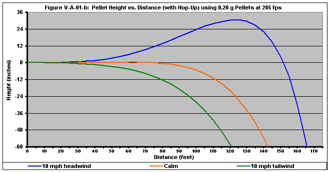 Some quick data mining helped to explain why spinning shots gained distance when fired into a headwind. As was explained in detail in Section III: Effects of Hop-Up, the amount of lift generated by a spinning BB is directly dependent upon the ratio of rotational velocity (V) to the linear velocity (U). High V/U causes significant lift; low V/U does not. When firing into a headwind, the linear velocity U decreases at a much faster rate than normal, while the rotational velocity V decreases at the same rate regardless of whether it is calm, a headwind or tailwind. For a headwind, V stays the same but U is lower, meaning that the ratio of V/U is ultimately higher, leading to greater lift. Essentially, shots fired into the wind tend to "over hop" leading to greater trajectory.