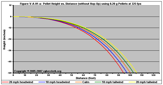 When firing into a headwind (wind flowing from target to shooter) or tailwind (wind flowing from shooter to target), it is perfectly sensible to expect the wind to affect the trajectory of the BB. Figure V-A-01-a shows the modeled trajectories of a 0.20g BB fired at 325 fps into varying wind conditions. As expected, a non-spinning shot fired into a headwind would experience additional drag, consequently retarding its forward motion. Conversely, a tailwind will prolong the BB's trajectory as the BB will experience less drag over the course of its trajectory.