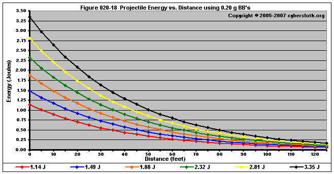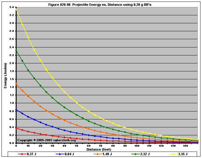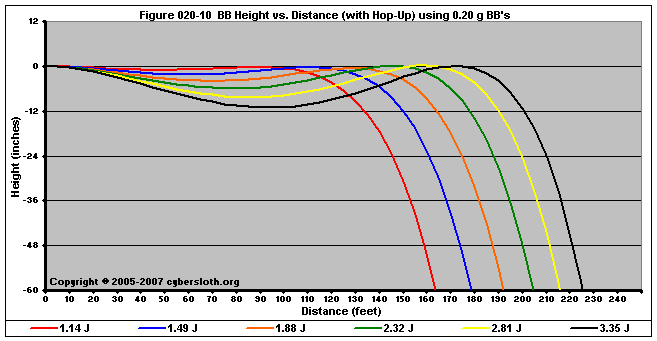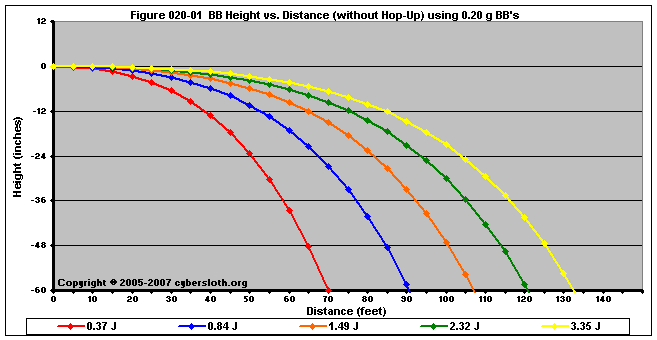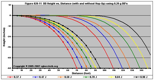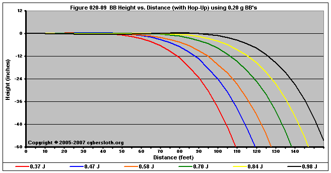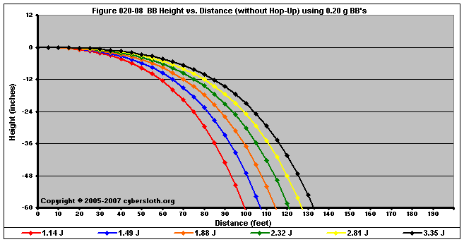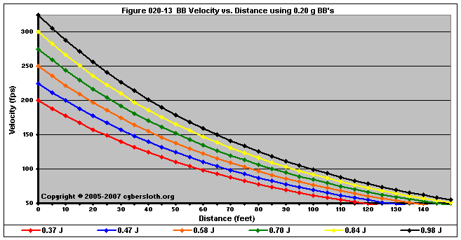 Note that the charts display muzzle energy rather than muzzle velocity. This was done for the sake of consistency. For this section, the muzzle energy can be compared to the equivalent muzzle velocity if 0.20g BB's are used, as well as the actual muzzle velocities for the given BB weight.