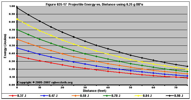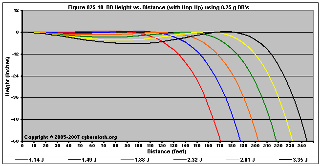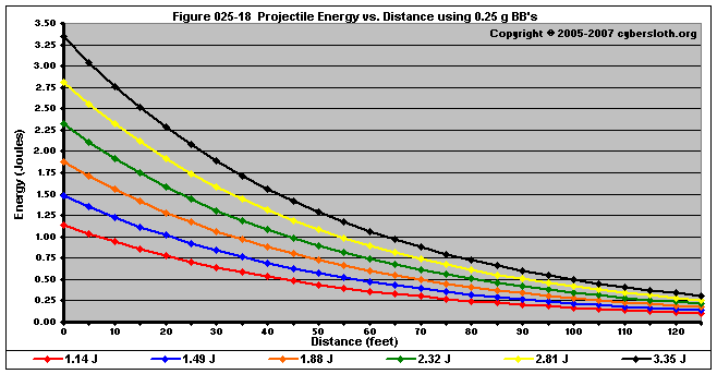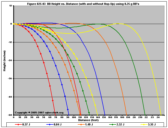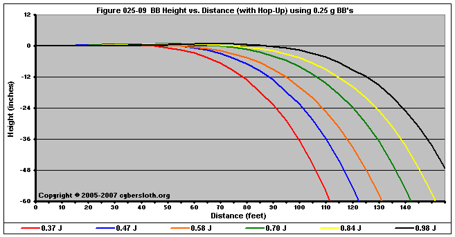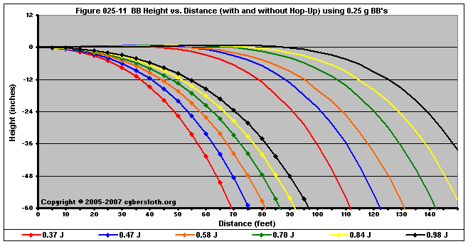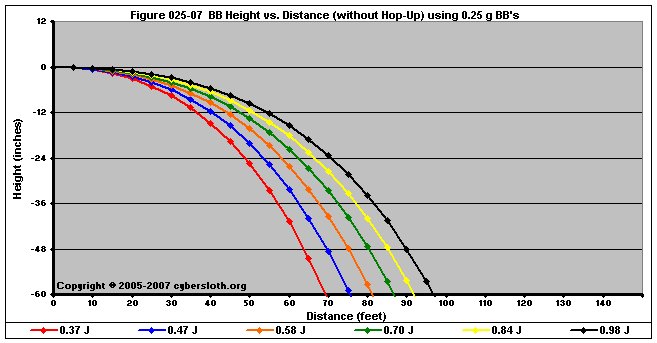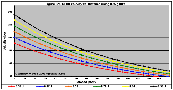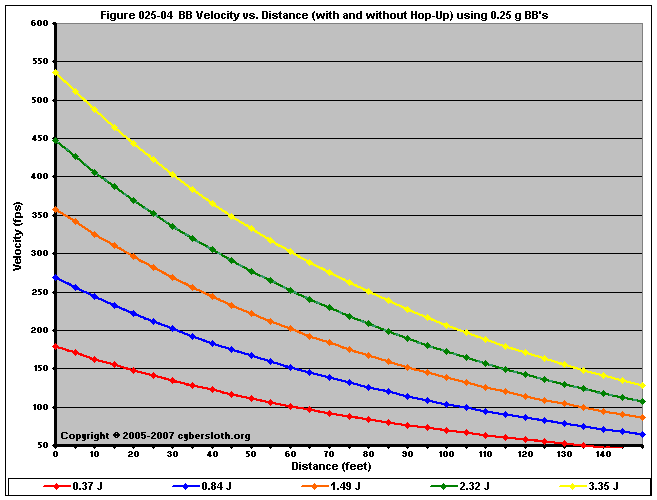 Note that the charts display muzzle energy rather than muzzle velocity. This was done for the sake of consistency. For this section, the muzzle energy can be compared to the equivalent muzzle velocity if 0.20g BB's are used, as well as the actual muzzle velocities for the given BB weight.