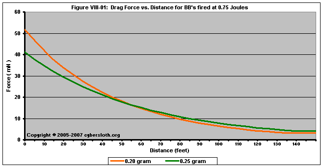 To illustrate this, here are charts depicting the deceleration and drag force experienced by a 0.20g and a 0.25g BB fired at 0.75 Joules (or 285 and 255 fps respectively). In Figure VIII-01, we can see that the drag experienced by the 0.20g BB is initially much greater than the drag experienced by the 0.25g BB. At about 53 feet, the drag force for both BB's are equal. This is simply because the drag equation does not take into account mass, but instead is primarily governed by velocity. At a distance of about 53 feet, both BB's are moving at about 165 fps, consequently they are experiencing the same drag force at that distance.