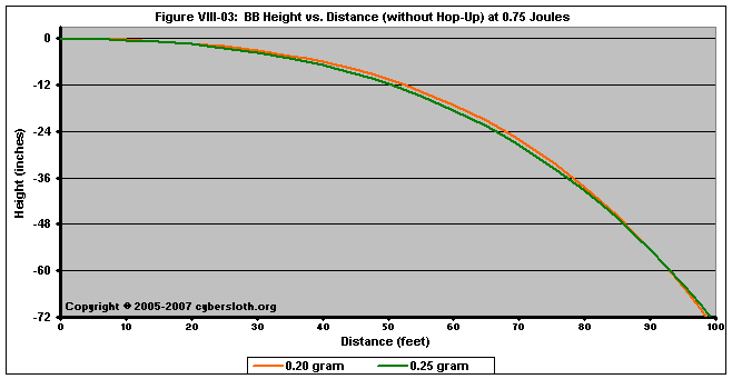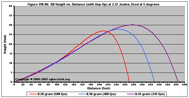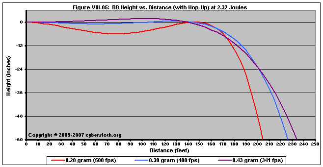 In Figure VIII-05, we see the trajectories of 0.20g, 0.30g, and 0.43g BB's fired at 2.32 Joules. At such a higher power, 0.20g BB's experience wild trajectories. If the shooter is aiming above their target at over 225 feet, 0.43g BB's do indeed go further, but it is the 0.30g BB that produce the desired trajectory.