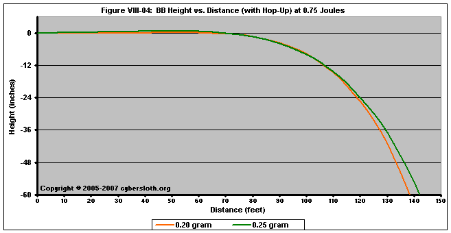 In other words, there isn't an easy answer to the question of which BB goes further. Frankly, a lot of the answer comes down to semantics, namely what we describe as "effective range." In Figure VIII-04, we see the effects of hop-up on the same 0.20g and 0.25g BB's as above. If we consider "effective range" as the distance at which a BB experiences the least amount of deviation from the aim point out to 100 feet, then both BB's perform similarly. If a person is using a sniper rifle and is aiming at a target that is 140 feet away, and considers this the effective range for their sniper rifle by using holdover, then the 0.25g BB will travel further. Again, there isn't a clear answer, but rather depends on what the shooter defines as "effective range." (And... it would be hard to see a difference in trajectory between the two BB's as the trajectories are very similar.)