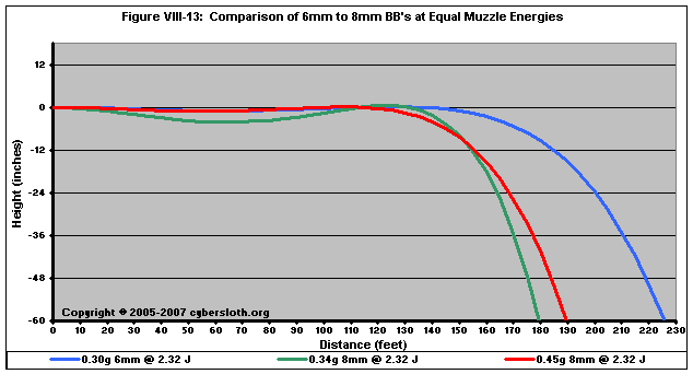 However, like most things, this is a subject that requires a little interpretation. First up is a comparison of BB's fired at 2.32 Joules, the equivalent of 500 fps with 0.20g BB's. For the examined BB's, this would be equivalent to 408 fps with the 0.30g 6mm, 384 fps with 0.34g 8mm, and 333 fps with 0.45g 8mm. Figure VIII-13 depicts the trajectories: