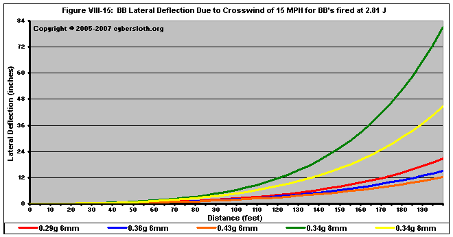 Figure VIII-15 depicts the lateral deflection of various 6mm and 8mm BB's fired at 2.81 J in a 15 mile-per-hour cross wind.